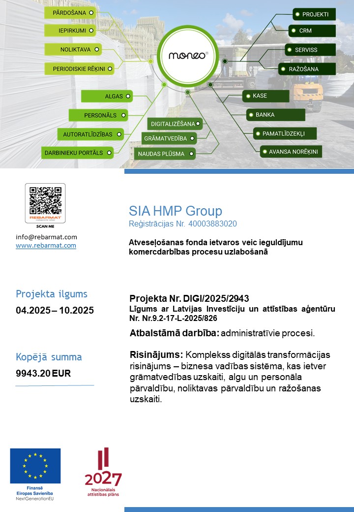 SIA HMP Group turpina attīstību, ieguldot procesu digitalizācijā un automatizācijā Latvijas Atveseļošanas un noturības mehānisma plāna 2. komponentē “Digitālā transformācija”. Projekts tiek īstenots 2.2. reformu un investīciju virziena “Uzņēmumu digitālā transformācija un inovācijas” 2.2.1.r. aktivitātē “Uzņēmējdarbības digitālās transformācijas pilna cikla atbalsta izveide ar reģionālo tvērumu” un 2.2.1.2.i. investīcijā “Atbalsts procesu digitalizācijai komercdarbībā”.