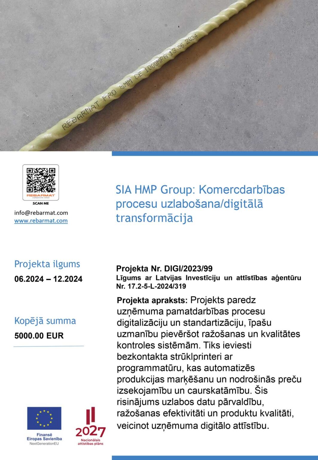 Projekts tiek īstenots saskaņā ar Latvijas Atveseļošanas un noturības mehānisma plāna 2. komponentes “Digitālā transformācija” 2.2. reformu un investīciju virziena “Uzņēmumu digitālā transformācija un inovācijas” 2.2.1.r. “Uzņēmējdarbības digitālās transformācijas pilna cikla atbalsta izveide ar reģionālo tvērumu” 2.2.1.2.i. investīciju “Atbalsts procesu digitalizācijai komercdarbībā”.